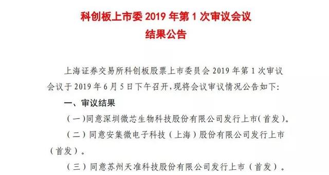 6月5日,上交所召开科创板上市委第一次审议会议,首批3家企业深圳微芯生物科技股份有限公司、安集微电子科技(上海)股份有限公司、苏州天准科技股份有限公司均成功过会。