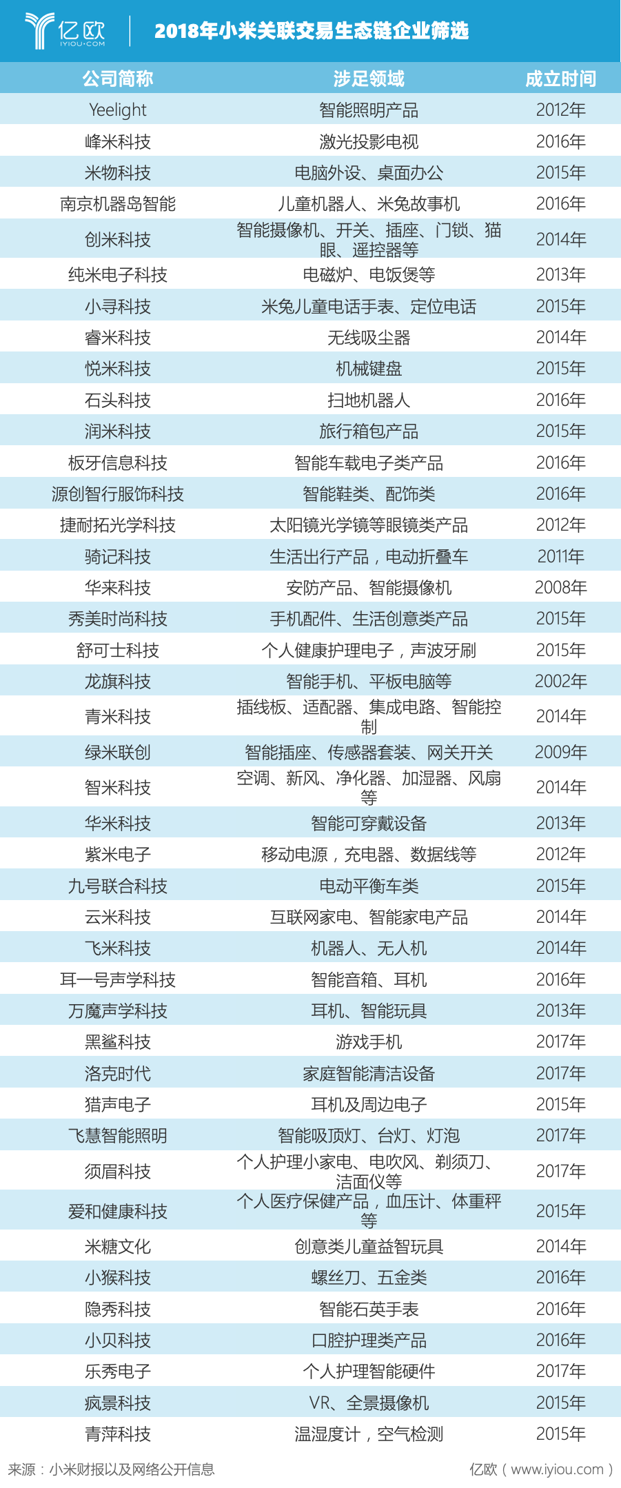 小米在招股书和上市后的首份年报里披露,截至2018年3月31日,小米共投资或孵化超过210家公司,其中包括90多家都是做智能硬件及生活消费产品的,2018年底小米共投资了超过100余家生态链企业,涉及上百个行业 。