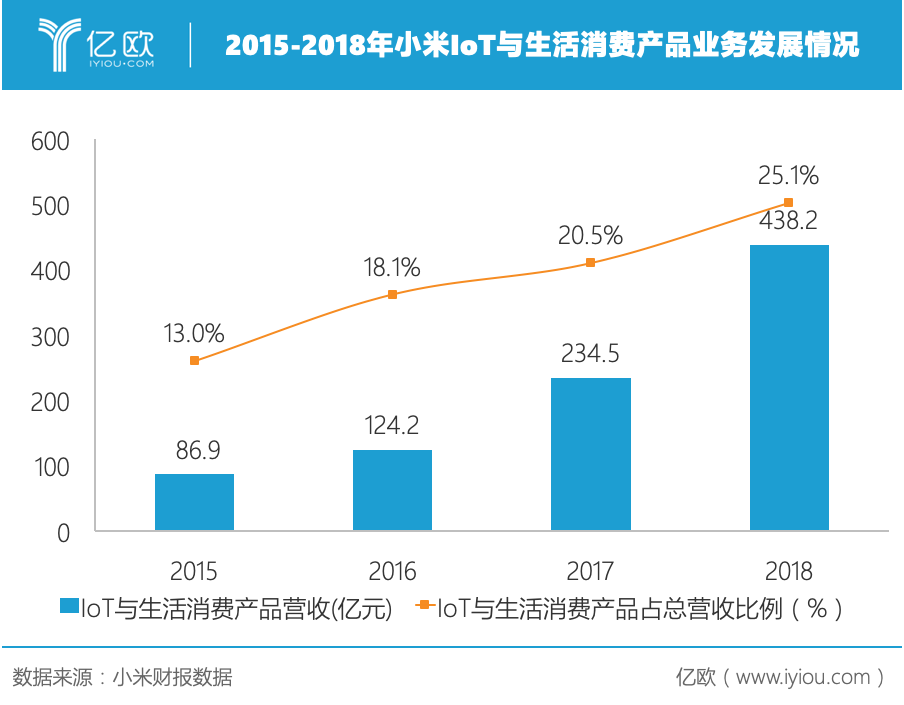 智能手机是小米的起家生意,财报显示在2018年仍占到小米总营收的65.1%,收入达1138亿元,同比增长了41.3%,虽然数据看上去很漂亮,但众所周知智能手机大环境已不容乐观。