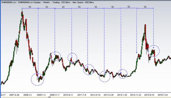 沪指受制于52周循环周期。上图显示,上证指数周线图中,于2007年10月的顶部开始,与其后低位相隔52个星期,其后的每个52个星期,都会产生转势,如大盘见顶或见底。