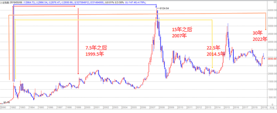 那么,中国股市有周期吗?在江恩的周期理论之中,30年周期循环是理论的核心之一,而30年周期循环可再分割成以下5个子周期:30 年周期、22.5 年周期、15 年周期、10年周期、7.5 年周期。