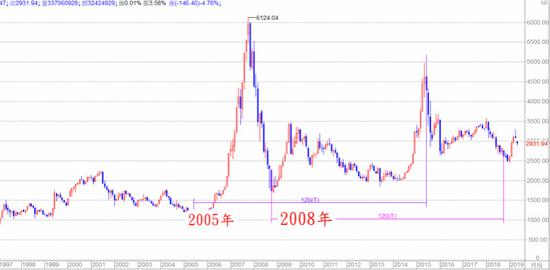 以上图上证指数为例,上证指数于2005年见998点的低位后,120个月后(10年)正好在2015年见了牛市的高点;2008年10月见了1664点的低位后,121个月后见了2018年的最低位置。