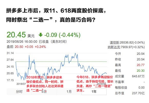 【拼多多股票下跌与“二选一”有何关联?】拼多多2018年7月上市至今,迎来两次股价探底。有意思的是,作为电商平台,这两次股价下跌一次发生在去年双11,一次是今年618。4月24日,拼多多发布2018财年年报,全年亏损总额达102亿元。无独有偶,在股票下跌期间同时祭出“二选一”碰瓷友商,这背后,是拼多多连续亏损,迫切需要盈利?$拼多多(PDD)$ $阿里巴巴(BABA)$