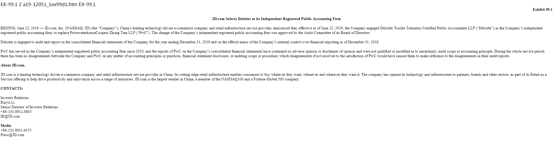 6月24日,京东向SEC提交了一份文件,决定更换会计师事务所。京东在提交给SEC的文件中披露,自2019年6月22日起,普华永道不再承担京东审计工作,公司改聘德勤为新的会计师事务所。
