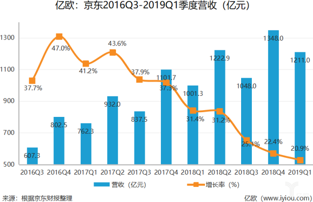 2019年一季度财报显示,京东营收增速继续放缓,仅同比增长20.9%,创下了京东自IPO以来的最低增速记录。