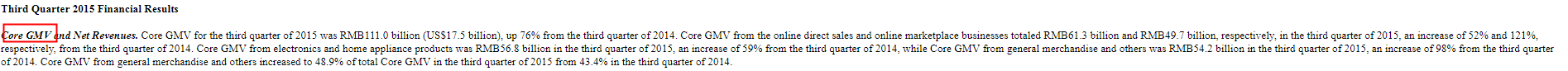 2015年第三季度,京东GMV1150亿元,同比增长71%。而在财报中,京东不仅披露GMV,还首次披露 Core GMV (核心GMV),剔除了拍拍。调整后2015年第三季度,京东核心GMV为1110亿元,同比增长76%。