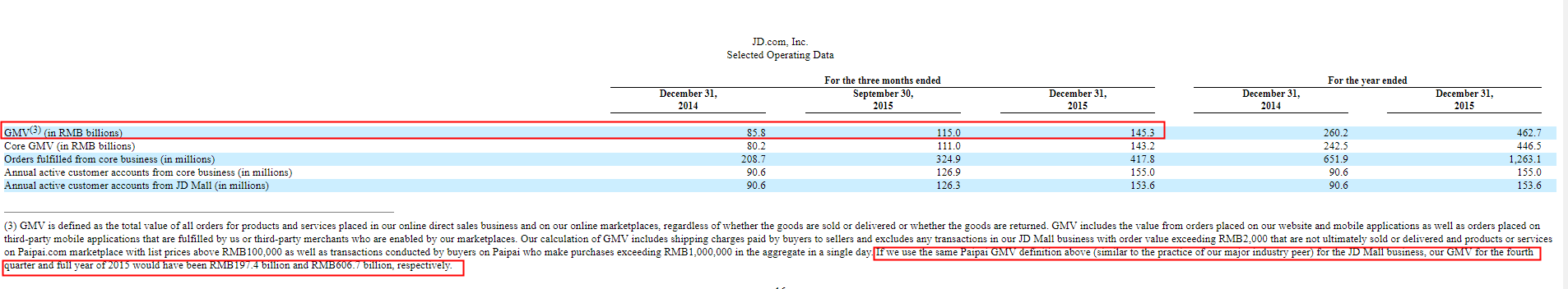 2015年第四季度,京东季度GMV为1453亿元。在财报中,京东再次对Core GMV的统计口径进行调整,将京东以外的第三方平台完成的交易(比如微信)统计到Core GMV中;与此同时,京东还在业内开创性的引入“友商口径”GMV,采用所谓的“友商口径”后,京东第四季度GMV激增至1974亿元,进一步提高了36%。