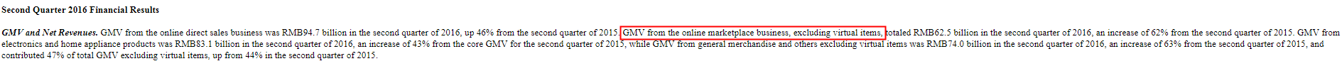 2016年第二季度,京东在财报中首次单独披露剔除虚拟物品之后的实物GMV数据(GMV excluding virtual items),而自2017年开始,京东又把这个数据从财报中隐藏掉了。不少分析人士推测,剔除虚拟物品后的GMV增速开始放缓,因此,京东不再单独披露实物GMV。