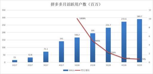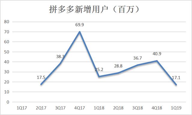 2019年第一季度,拼多多MAU达到2.897亿,同比增长了74%,增速放缓的同时,单季新增用户规模也在急剧降低。