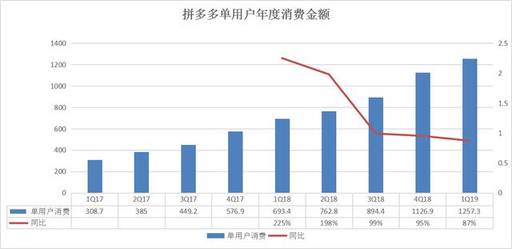 2019年第一季度,拼多多用户平均年度消费金额为1257.3元,较去年同期提升了87%,不过增速也是连续5个季度下滑。接下来,拼多多客单价仍然有提升空间,但是增速放缓也是肯定的。