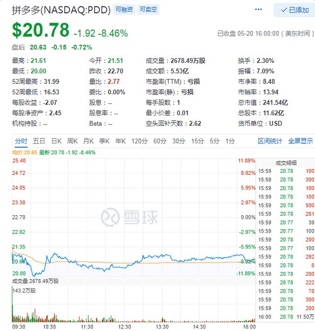 5月20日, $拼多多(PDD)$ 发布了2019年第一季度财报,财报显示,拼多多一季度营收45.452亿元,同比增长228%。财报发布后,拼多多盘前上涨,但美股开盘后便突然暴跌,一度跌逾11%。截至收盘,拼多多跌8.46%,一些投资者在股票社区上抱怨,为什么跌了这么多?