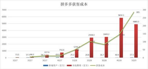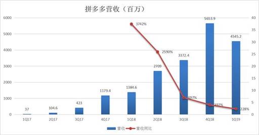另外,根据 $阿里巴巴(BABA)$ 公布的财报,2019年第一季度(自然年)淘宝天猫新增用户2200万,这也就意味着,拼多多的单季新增用户低于淘宝天猫,也是拼多多第一次落后于淘宝天猫。这很值得投资者担忧,体量远远小于天猫淘宝的情况下,增速还比淘宝天猫低,接下来,拼多多要怎么去维持快于淘宝天猫的高增长?