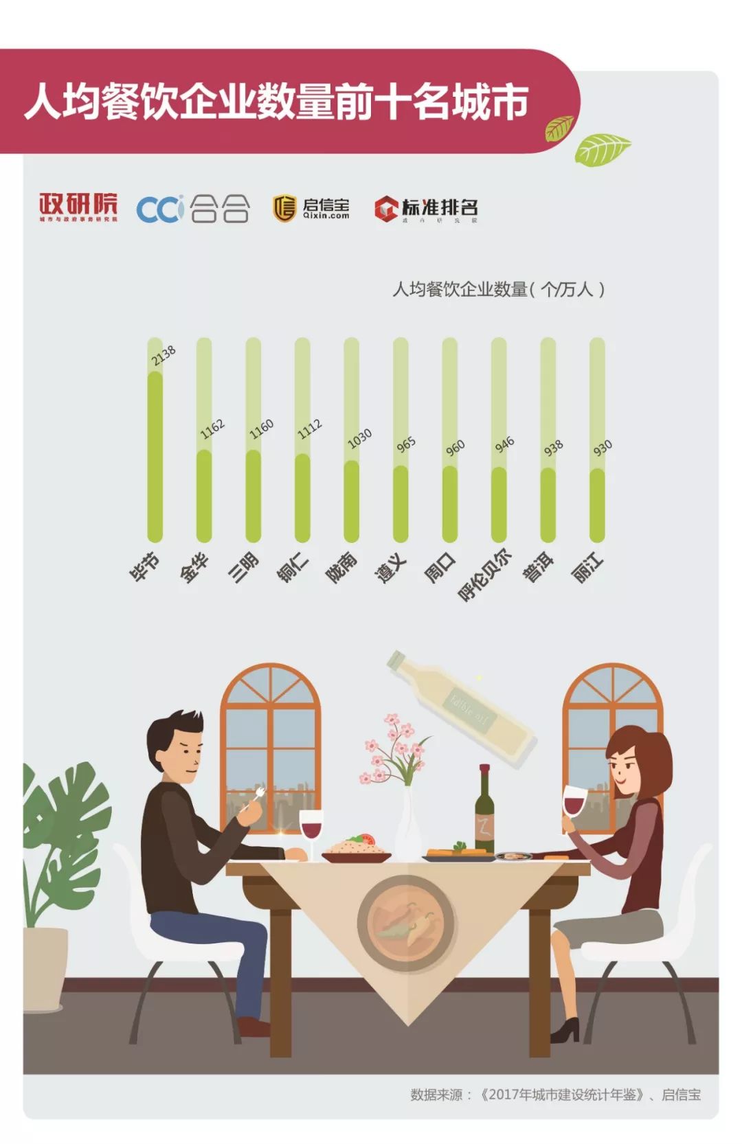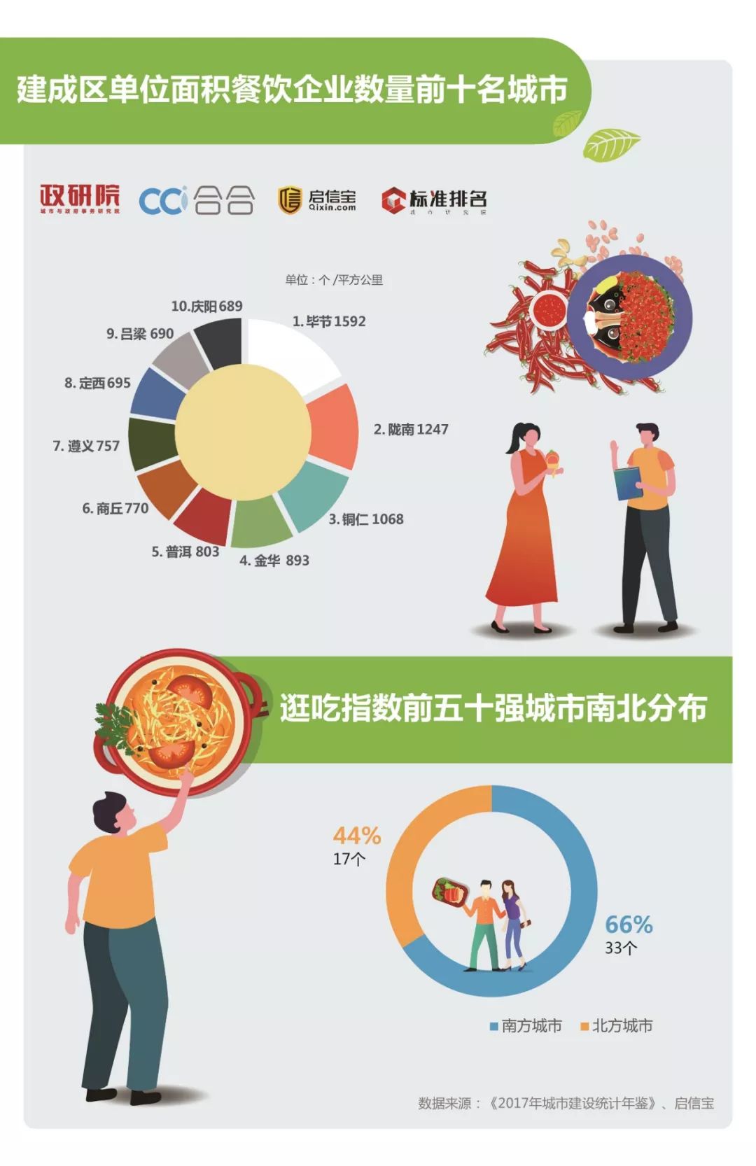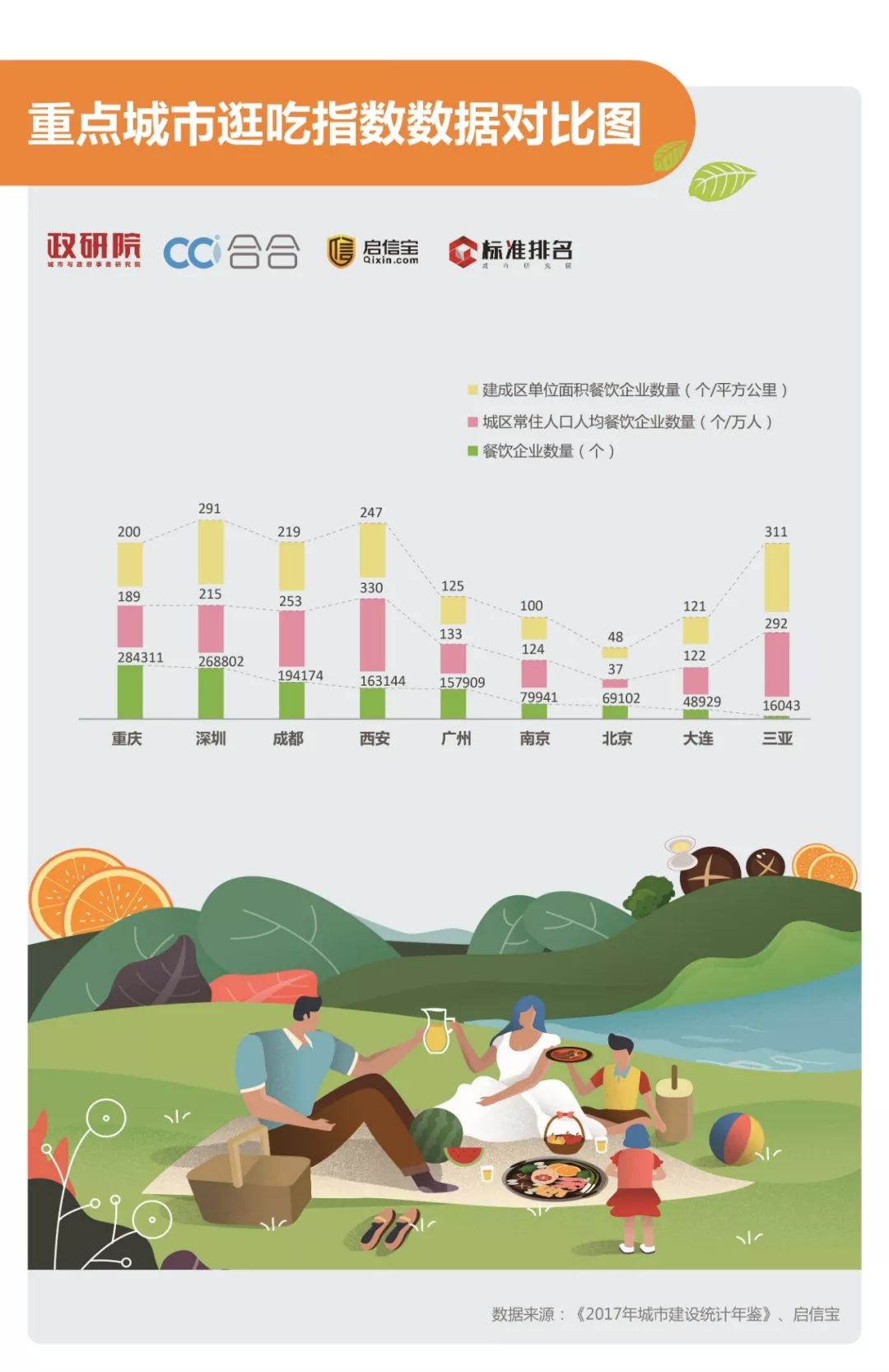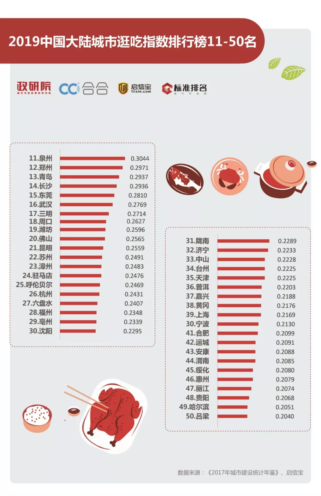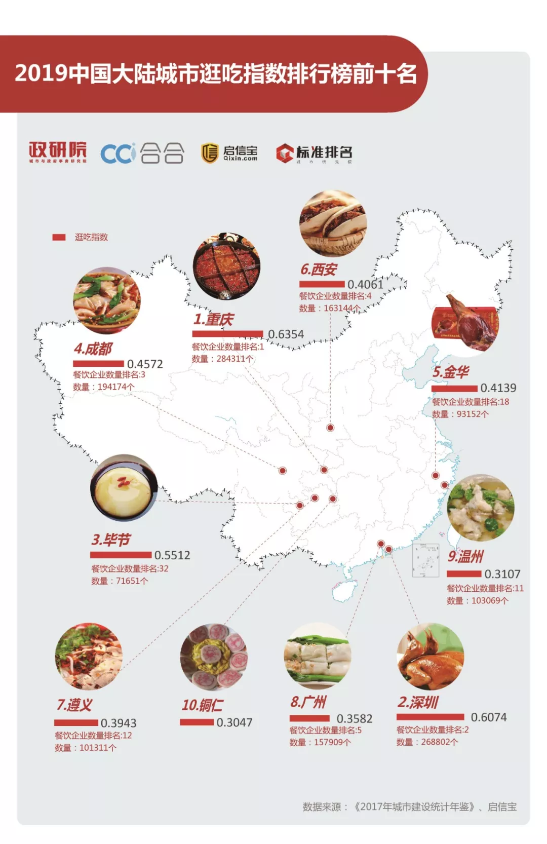 本榜单所用城区常住人口和建成区面积数据来自于中华人民共和国住房和城乡建设部于2019年1月24日发布的《2017年城市建设统计年鉴》,餐饮企业数量数据来自于启信宝,而启信宝是从全国企业信用信息公示系统、中国法院裁判文书网、中国执行信息公开网等100家网站提取官方数据,所有数据均由国家公开发布在网络。