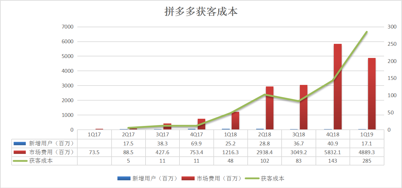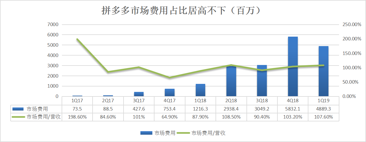 拼多多市场费用在营收中占比一直居高不下,2019年第一季度,市场费用连续2个季度超过总营收。