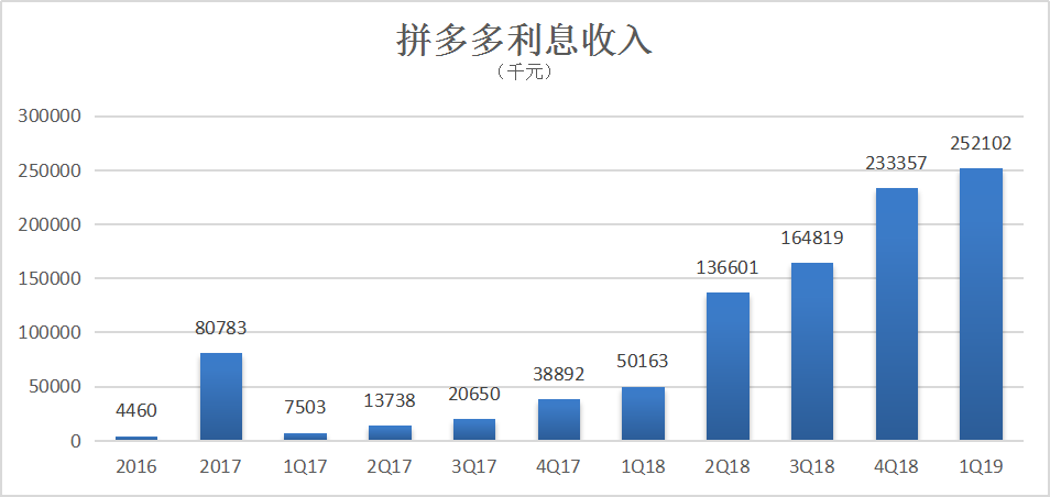 拼多多是平台型电商,随着交易额和商户规模的不断扩大,沉淀资金产生的利息收入也不断增长。未来很有可能成为拼多多非常重要的利润来源。