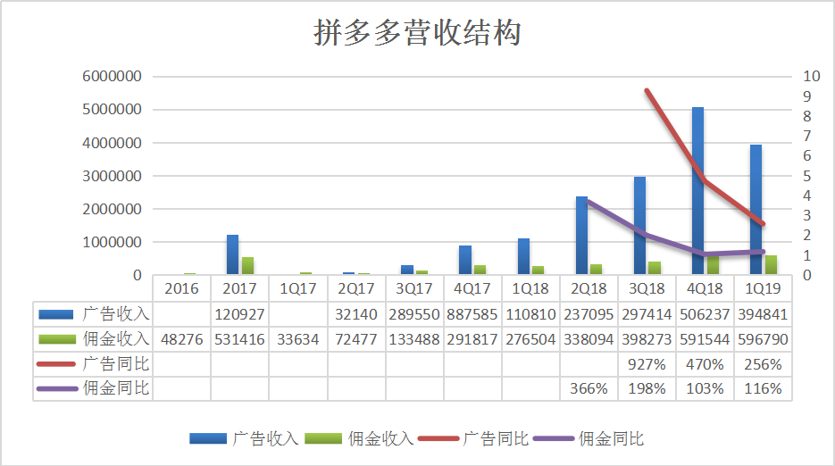 拼多多营收主要分为在线市场服务和佣金收入,其中在线市场服务收入主要是指商户的广告服务产生的收入。