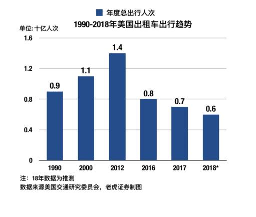 如图,在Uber和lyft兴起后,美国出租车的年度出行人次出现了显著下滑。
