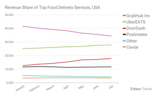 DoorDash的增长势头太猛,以致GrubHub和UberEats都在2018年7月以后被挖掉市占率。