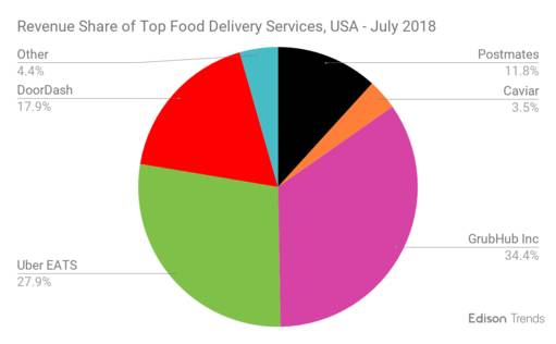 根据Edison Trends去年年中的调查(2018年7月),GrubHub $(GRUB)$作为外卖市场大哥占有超过三分之一的市场份额(34.4%),再排下来就是Uber Eats,有27.9%,第三大的DoorDash当时只有17.9%的市占率。