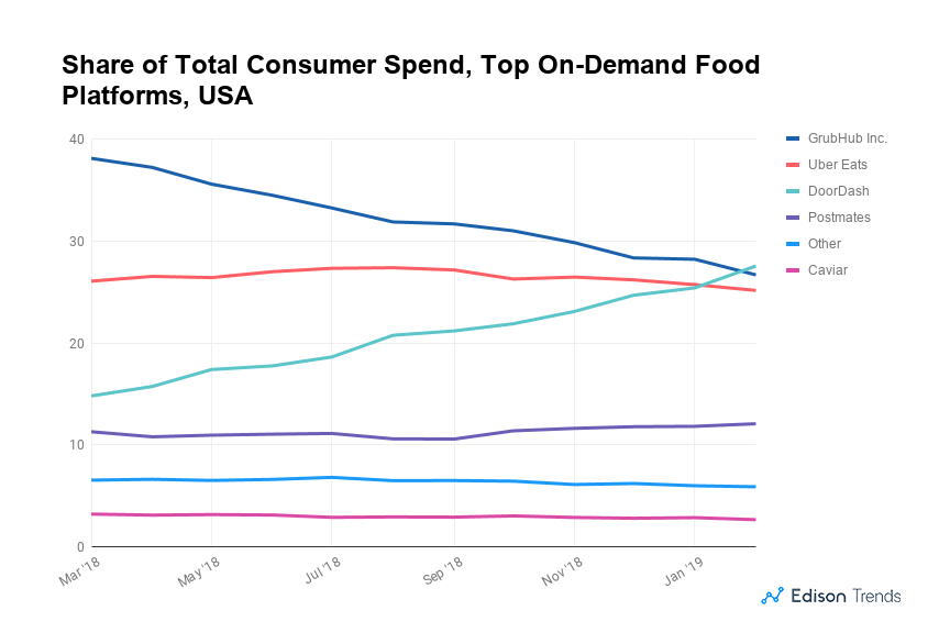 截止2019年3月,DoorDash已经成为外卖一哥。DoorDash、GrubHub和Uber Eats平分天下。UberEats成功掉到老三。
