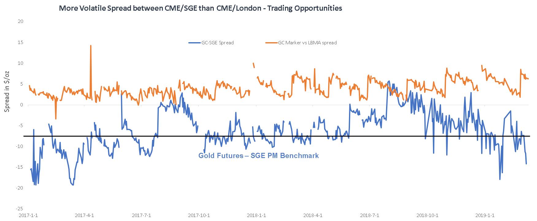 套利的交易动作和对冲一样的,也是一多一空的组合,只是套利往往是在相关性极高的品种之间进行交易,例如黄金。黄金是世界公认的等价物,拿着实物黄金到世界哪个国家都会认可并且可以交换等价物,因此黄金在金融市场中有很多衍生品种,既有现货市场(如伦敦),也有期货市场(如COMEX、上海期货),也有期权市场等等。由于不同地区不同市场之间存在流动性以及定价效率的问题,所以简单地说不同的黄金合约之间存在价差,而理论上该部分价差提出固定成本后(仓储、运输成本)理应为0,因此假如两者价差超过一定幅度则可视为具有套利空间。如下图