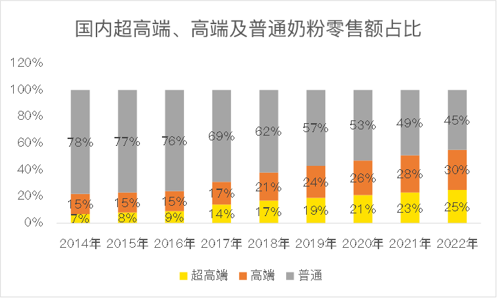 另一面,奶粉市场的消费升级从未停歇,2014年至2019年,超高端奶粉的市场占比从7%提高到19%,不断挤压普通奶粉的市场份额,而中国飞鹤在2010年即推出超高端品牌星飞帆,占尽了天时地利!