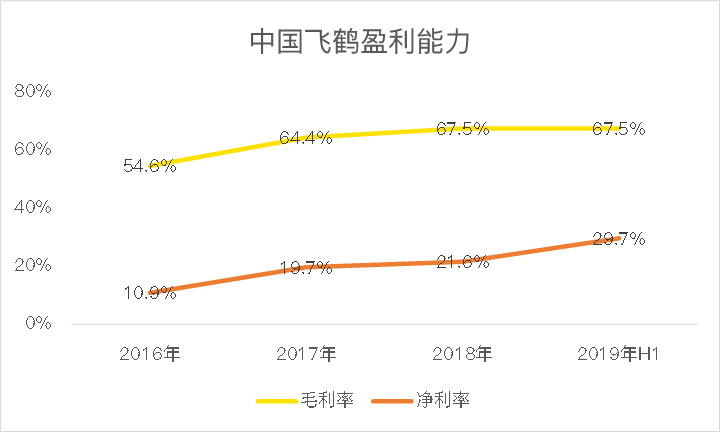 既然定位这么高端,盈利能力强悍也就不足为奇了,2019年上半年,中国飞鹤的整体毛利率为67.5%,净利率29.7%。