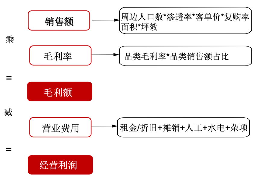 显然毛利率对于线下实体店的持续经营有着决定性的作用,“单店模型”的测算中,除周边人口数这个关键因素之外,毛利率需要单独进行详细核算和评估。