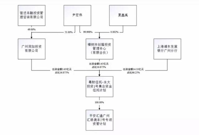 这份公告披露,浦发银行广州分行出资14.33亿元,为优先委托人;尹宏伟控制的创隆投资(尹持股99%)、广州同加投资(尹持股51%)各出资3.65亿元(合计出资7.3亿元),为一般委托人。