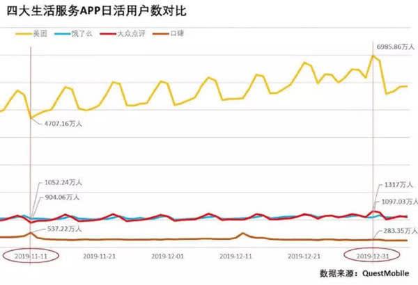 QuestMobile给出的这份数据还显示,从2019年11月至12月底,美团的日活用户数呈现快速上涨势头,而饿了么的上涨趋势明显不如美团,似乎饿了么已无力改变外卖市场的格局。