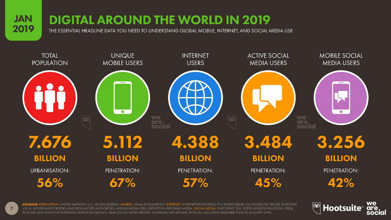We Are Social和Hootsuite发布的2019年数字报告显示,全球人口规模已达76.76亿,全球独立移动用户数亦达到了惊人的51.1亿人。此外,全球用户平均每天上网时长为6小时42分钟。这意味着,全球流量生态或将成为中国互联网公司未来的主要增长极。