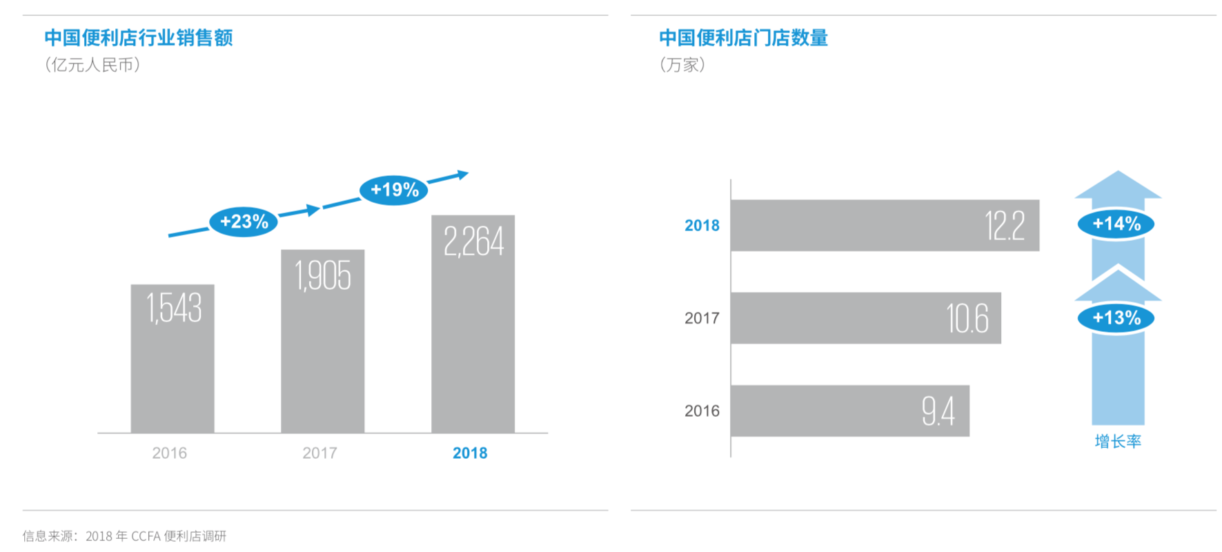 2018 年中国便利店实现销售额 2264亿元,门店数量增加12.2万家,行业整体增速达到19%。