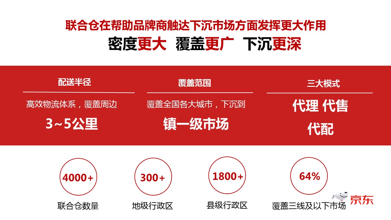 目前京东新通路的联合仓已经达到4000多家,覆盖300多个地级行政区,1800多个县,其中 64%覆盖三线及以下市场。