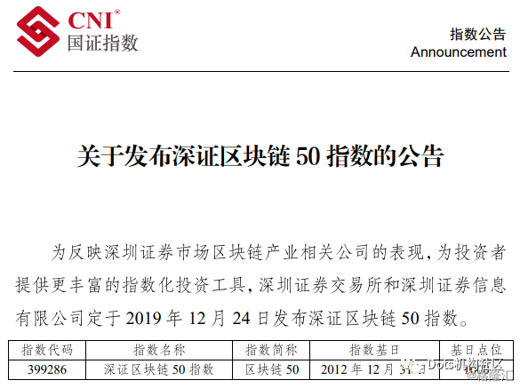 2019年12月24日,深圳证券交易所在其官网发布公告称,为反映深圳证券市场区块链产业相关公司的表现,为投资者提供更丰富的指数化投资工具,深圳证券交易所和深圳证券信息有限公司定于2019年12月24日发布深证区块链50指数,指数代码为399286。