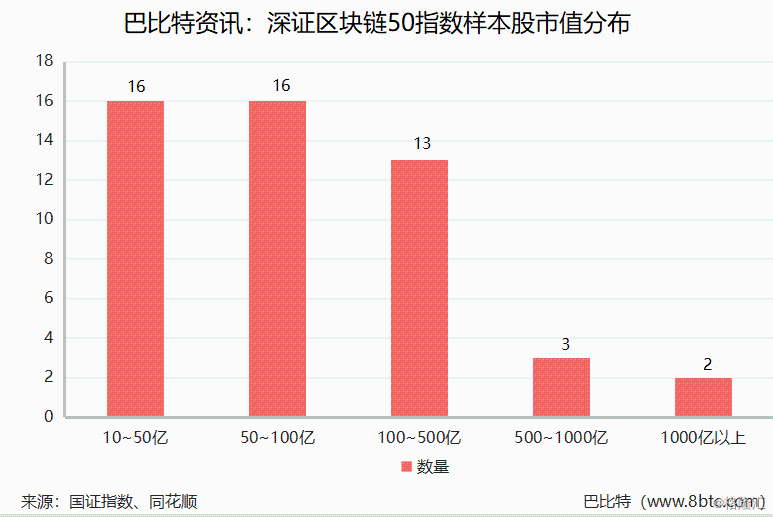 根据公告, 深证区块链50指数以深交所上市公司中,业务领域涉及区块链产业上中下游的公司为选样空间,按近半年日均总市值从高到低排序,筛选排名前50名的股票构成样本股。