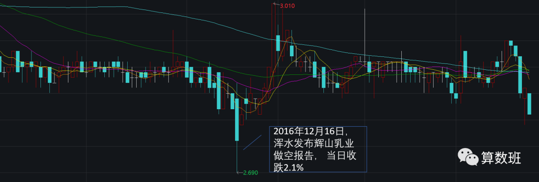 第一份做空报告发布当天,辉山乳业盘中一度下跌4.3%,至2.69港元,在跌幅逾2%后该股停牌。但在随后的交易日里,股价迅速反弹,最高升至3.01港元。直到三个多月后的2017年3月24日上午,辉山乳业突然暴跌逾90%。暴跌的原因是在浑水发布做空报告后,引起各大银行的警觉,并通过审计调查发现辉山乳业存在大量单据造假。公司资金链断裂的危机终于传导到了股价上。