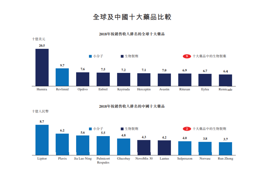 下图列示2018年全球及国内最畅销的十种药物。尽管全球最畅销的十种药物中有九种为生物制剂,惟中国最畅销的十种药物中仅有两种为生物制剂,显示国内生物制剂市场仍有巨大增长及扩展空间。