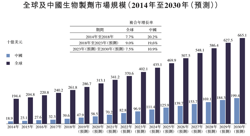 中国生物制剂市场近年的增长已超越全球生物制剂市场,此增长受一连串因素驱动,包括有利的监管环境及政府的支持性政策、生物疗法及定制疗法取得良好进展、生物制剂变得更易于负担及获取以及生物疗法的适应症范围更广。尽管近年来中国生物制剂市场急速增长,生物制剂在中国市场的渗透率仍然较低。在众多药品当中,生物制剂仍有巨大潜力,可于国内占取更多市场份额。