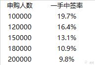 若最终落在平均数内,20%的甲组手数会给到1手党,根据之前分析的一手人数,若10万人申请,则中签率19.7%,20万人申请,一手中签率9.8%。