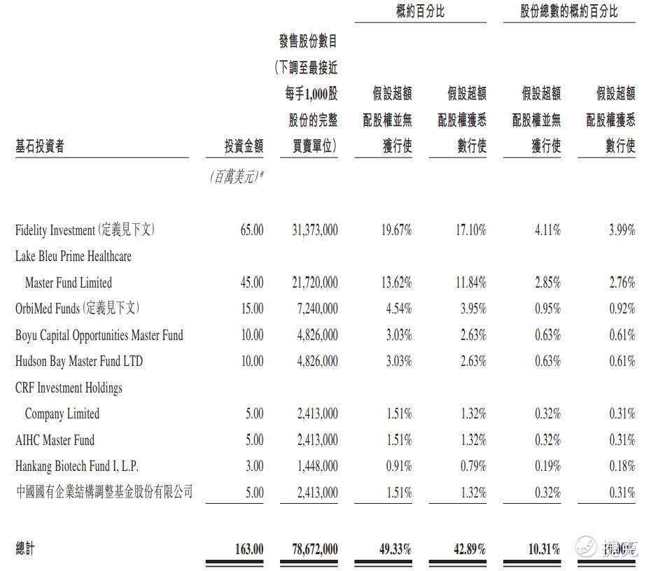 同时,康方的基石投资者也跟诺诚的一样,9家总计的份额,假若以最高的16.18港元发行价来算,已经在行使超额配股之前占据了所有发行股份的49.33%。言下之意是,若触发顶格50%回拨,给其他机构的国际配售份额仅为行使超额配股权后的15.67%。