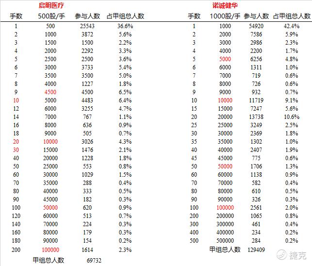 启明的一手中签率为30%,而诺诚为25%,实际结果相差不大。可是,启明的甲组有69732人,诺诚有129409人,为啥呢?因为诺诚甲组分配到的有6.25万手,而启明3.92万手。