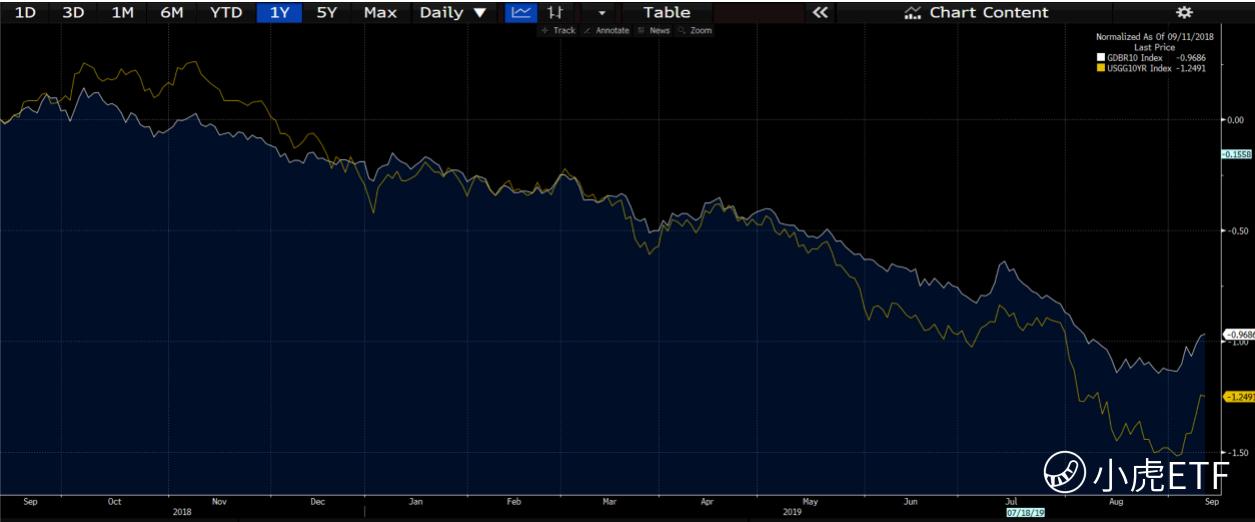 (黄色线是美国十年国债收益率,白线是德国十年国债收益率)