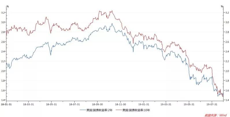 在美国债市收益率普遍下降的背景下,基准10年期国债的收益率自8月14日以来已多次低于2年期收益率。在健康的市场中,长期债券收益率要高于短期债券收益率。而债券收益率倒挂出现,往往是经济走向衰退的可靠信号。
