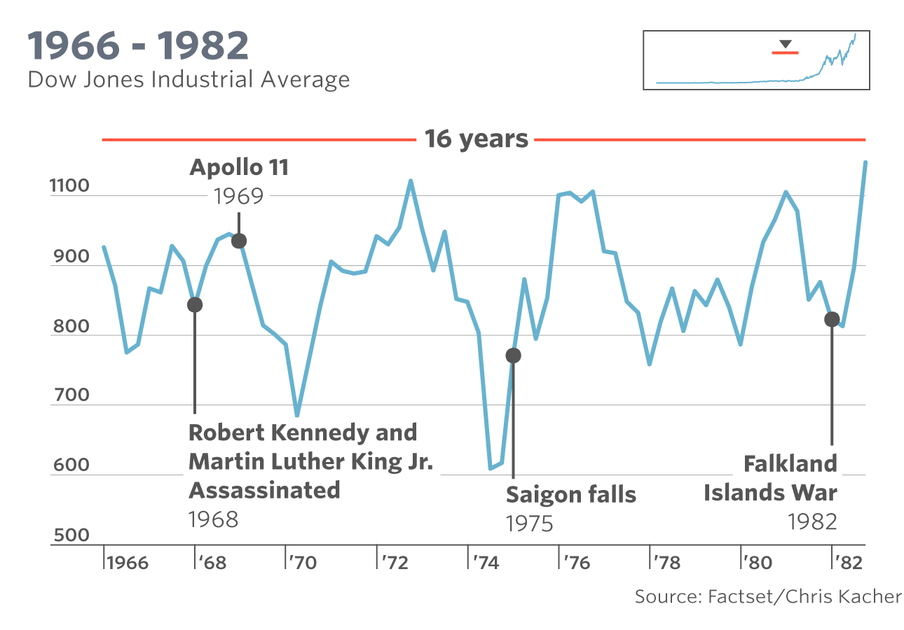 而1966年到1982年,在充斥着石油危机等各种动荡的70年代,市场用了16年才再一次恢复。