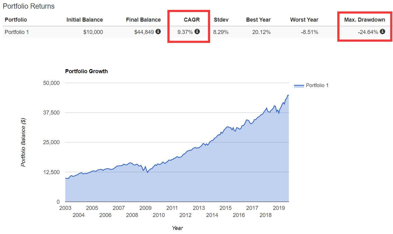 只是一个简单的组合,就表现出强大的力量,这一次,依然没有被清零,并且我们的复合年化收益为9.37%,几乎跟单独持有股票指数基金没有区别,而最大回撤,却从50.8%成功降低到24.64%。