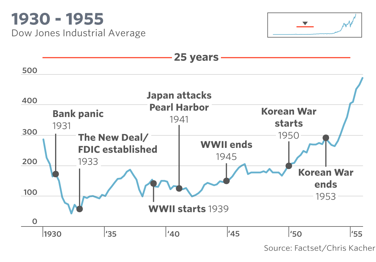 市场从1930年股市崩盘到1955年恢复,一共用了25年。