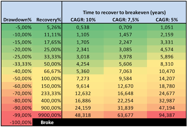 图中告诉我们,当我们的资产下跌后,需要对应上涨多少才能回本,后面的数据是如果按照三种不同的年化收益水平,需要多少年才能回本。
