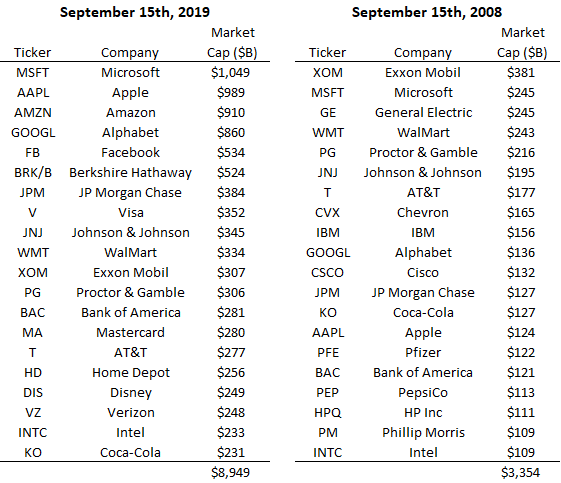 上图是2008年雷曼破产前夜美股估值排名与当前美股估值排名,仅仅十年的时间,整个榜单就已经发生了翻天覆地的变化。曾经的王者有多少“卸甲归田”?而当前的王者又有多少能“再创辉煌”?