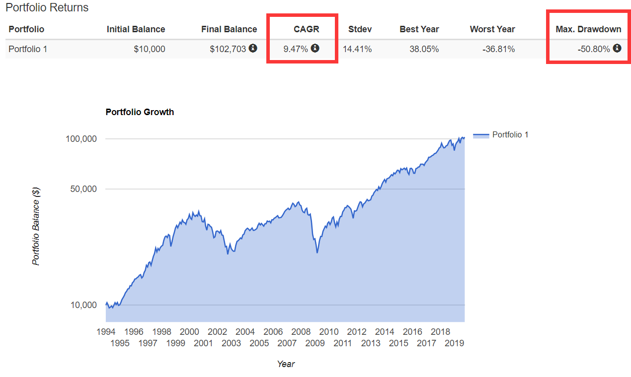 前面我们知道,持有单一指数基金是具备遍历性的,当我们持有 $标普500ETF(SPY)$ 的时候,历史回测如下: