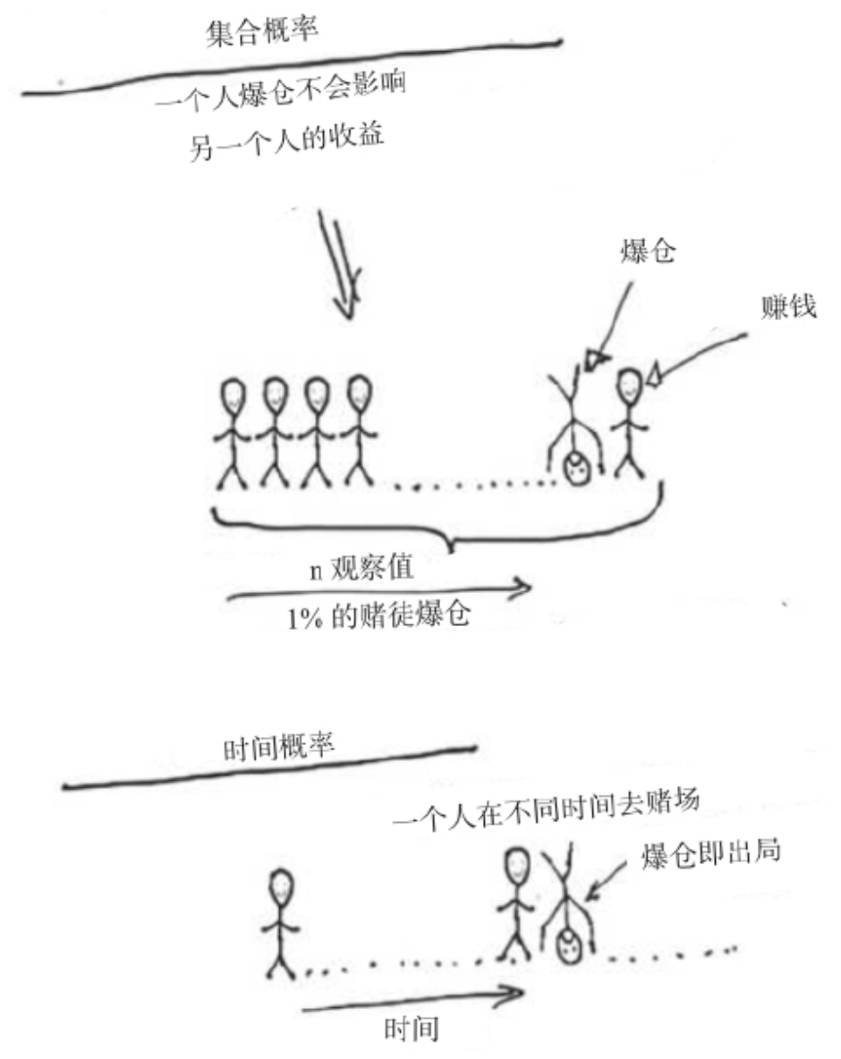 群体集合的成功概率并不适用于个体。尽管使用标准的成本收益分析可以清楚的看到这是一个不错的策略,但是对于个体来说,你可以非常容易的计算出小明最终破产的可能性是100%。就如同玩俄罗斯轮盘赌一样。